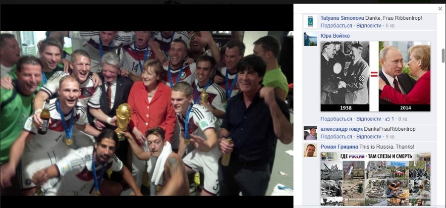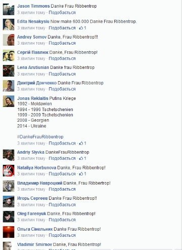 На офіційній сторінці канцлера Німеччини Ангели Меркель у Facebook’у 14 липня користувачі масового почали коментувати усі повідомлення стандартною фразою «Danke, Frau Ribbentrop!» (Дякую, пані Ріббентроп!).