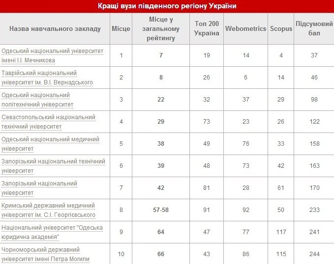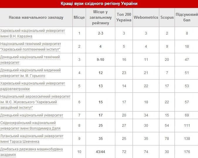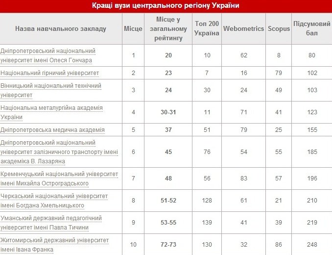 В Україні представили виші східного, західного, центрального і південного регіонів України, що посіли найвищі місця в рейтингу вищих навчальних закладів 2014 року.