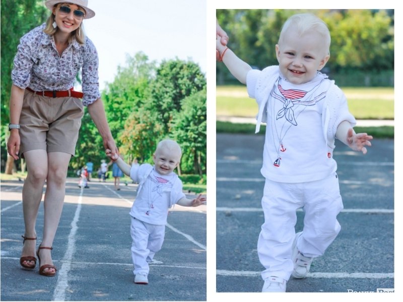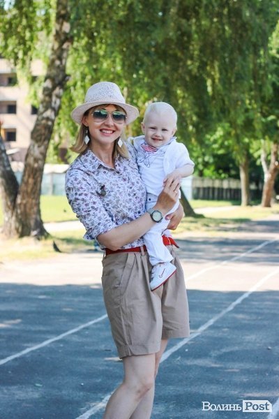 На фото мама Ірина Романюк одягнена у сорочку United Colors of Benetton, шорти і пасок від MANGO, босоніжки Strenesse Blue,образ прикрашають окуляри RAY-BAN, капелюх RESERVED, сережки та годинник.