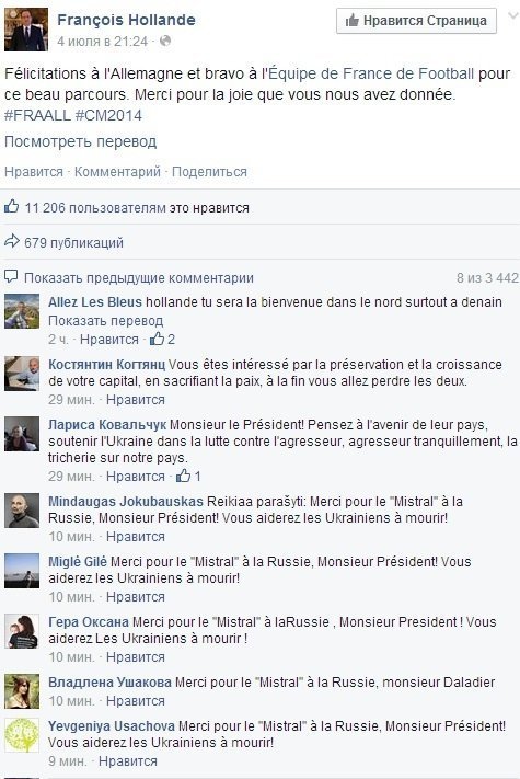 Коментарі, які українські користувачі залишають французькому президентові, переважно такі: «Ваші руки в крові українців!», «Спасибі за Mistral для Росії, пане президенте! Ви допоможете українцям померти!», «1,2 млрд євро прибутку за смерть тисяч українців», «Олланда у відставку!», «Спасибі, пане Петен».