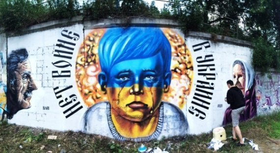 Хлопці-дизайнери намалювали обличчя хлопчика зі сльозами на очах. За його спиною - вогненний вир. Прикрашає малюнок напис: "Ні війні в Україні", - пише Gazeta.ua.