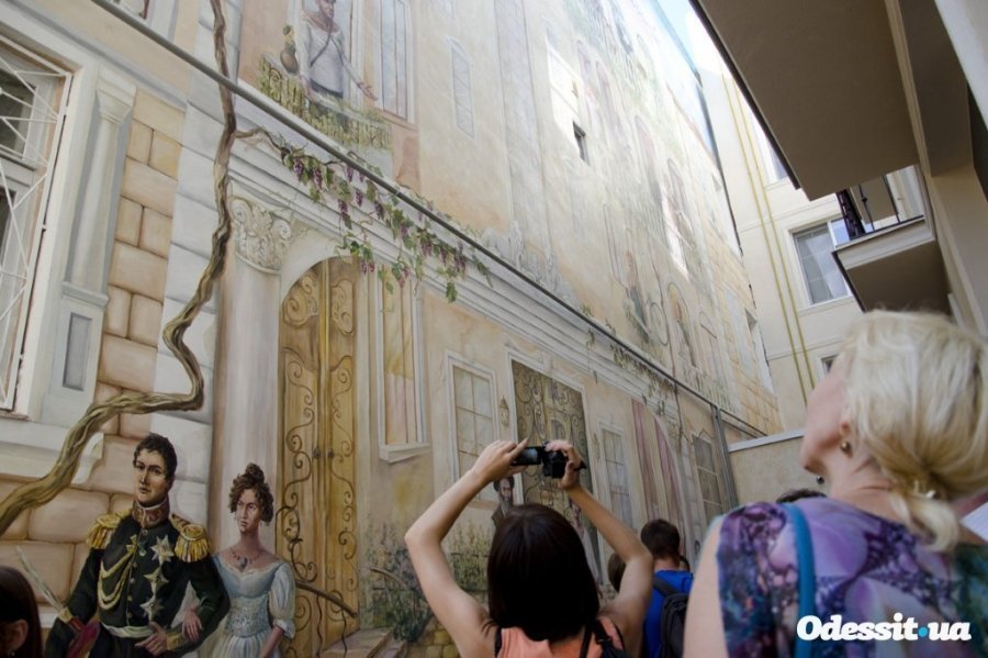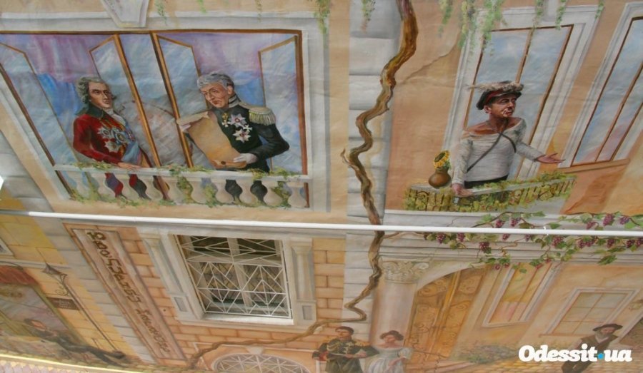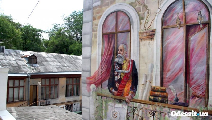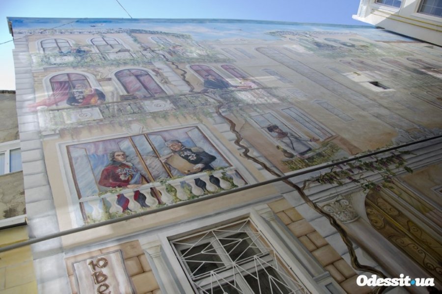 На фресці зображено будівлю, практично в кожному вікні якого одесити можуть побачити видатних особистостей і літературних героїв. Тут і прогулюються по вулиці Воронцови, влаштувався в кафе Олександр Пушкін, і декламує свої твори з верхнього балкона Михайло Жванецький. Є навіть одеський кіт, який краде камбалу у самого міського голови Григорія Маразлі.