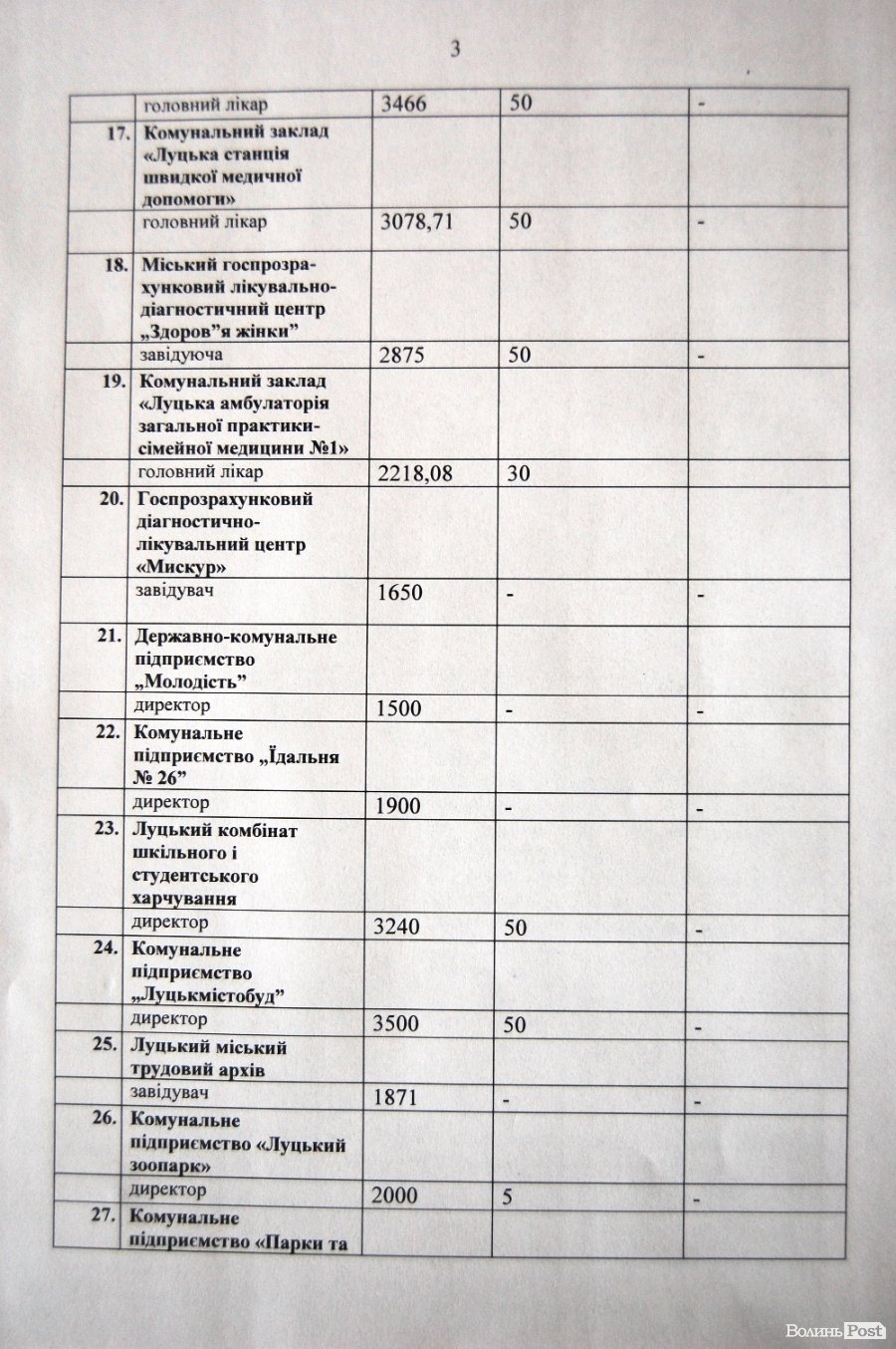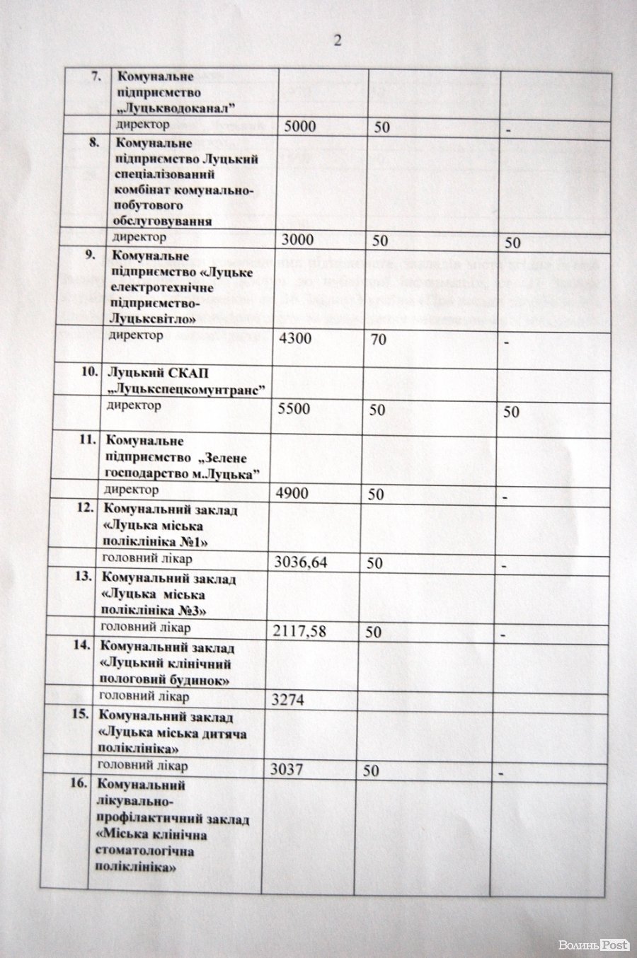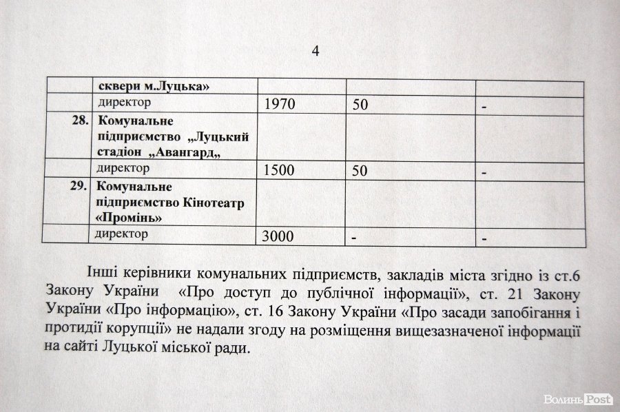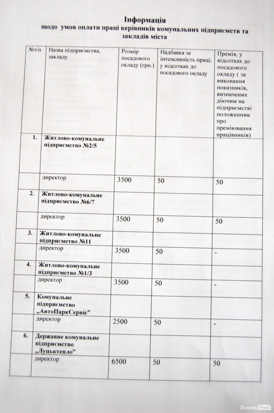 У документі вказано інформацію про зарплату керівників 29 комунальних підприємств міста. Решта, як сказано в документі, «згідно із ст.6 Закону України «Про доступ до публічної інформації», ст. 21 Закону України «Про інформацію», ст. 16 Закону України «Про засади запобігання і протидії корупції» не надали згоду на розміщення вищезазначеної інформації на сайті Луцької міської ради».