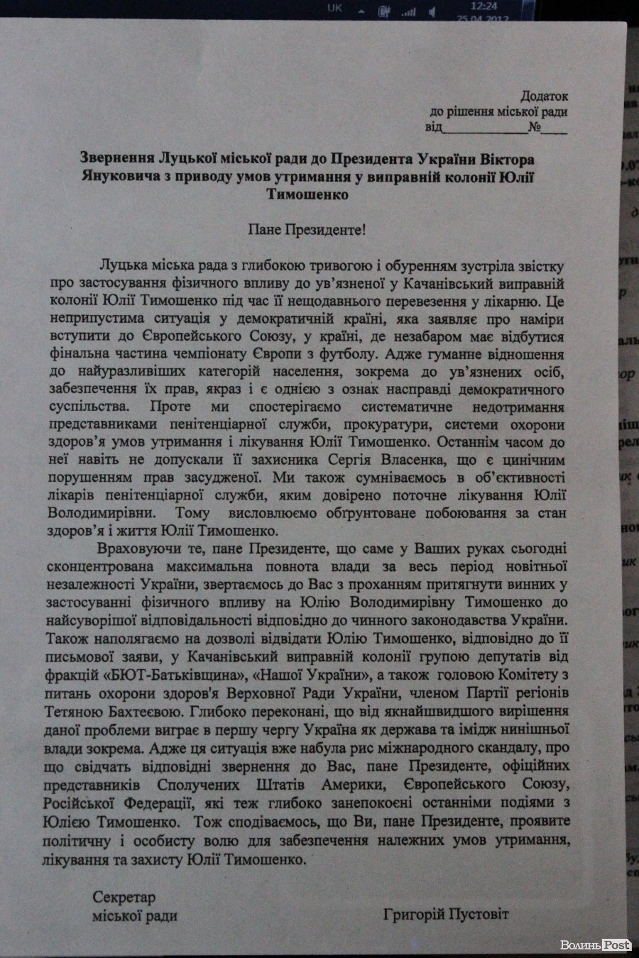 Луцька міська рада звернеться до Президента України Віктора Януковича щодо умов утримання Юлії Тимошенко в колонії.