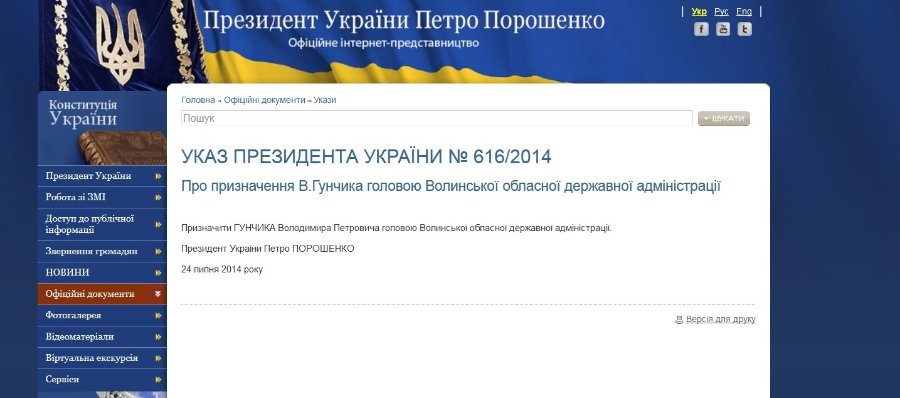 "Призначити ГУНЧИКА Володимира Петровича головою Волинської обласної державної адміністрації", - йдеться в указі.