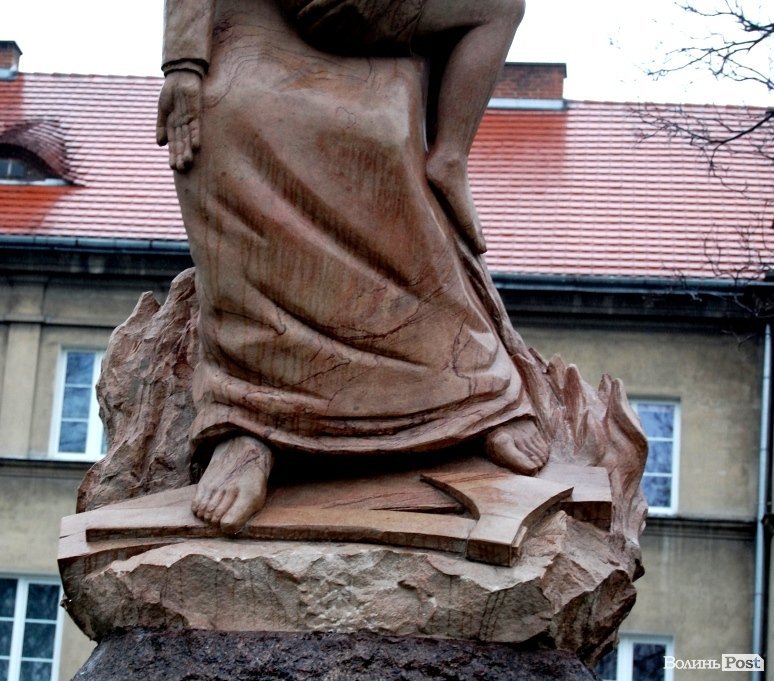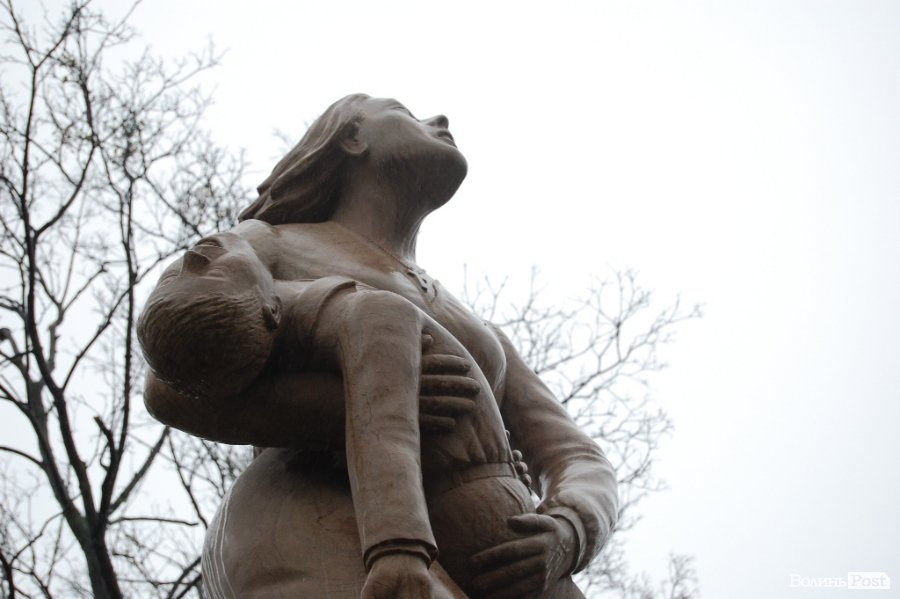 Простоволоса, боса з перекошеним від горя обличчям полячка тримає в руках мертвого хлопчика, під ногами у неї – сокира. «Якщо ми забудемо про них – Ти, Боже, забуть про нас», – написано на постаменті.
