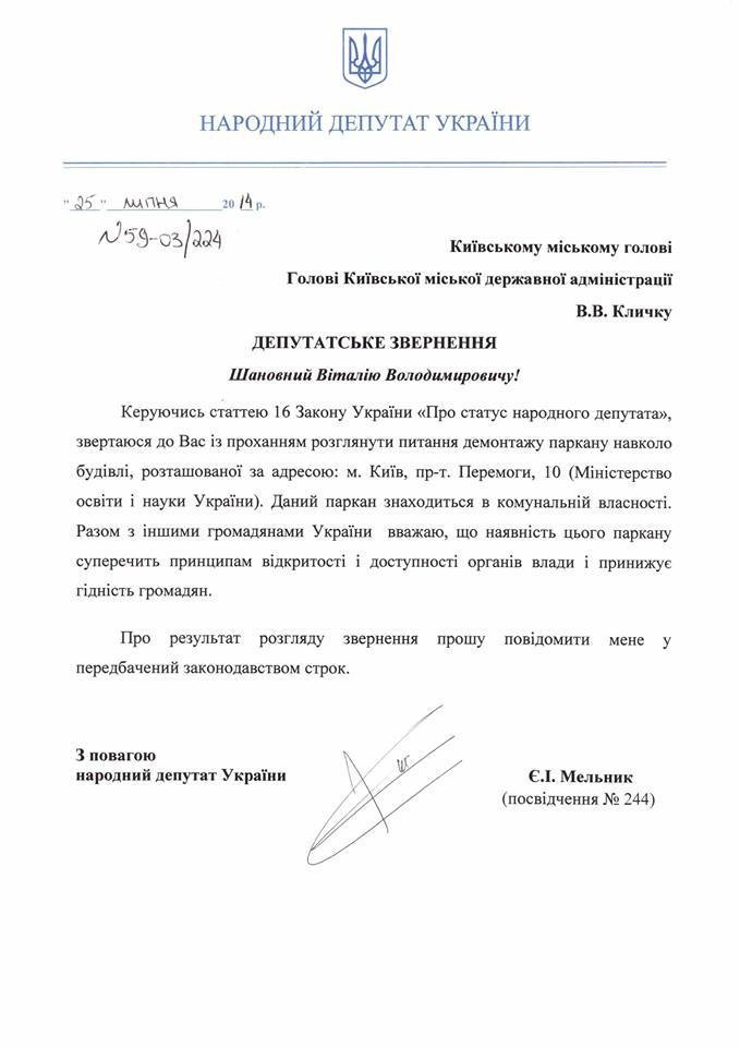 Народний депутат України Євген Мельник хоче, щоб Київська міська держадмінстрації ініціювала знесеннч паркану навколо будівлі Міністерства освіти та науки.