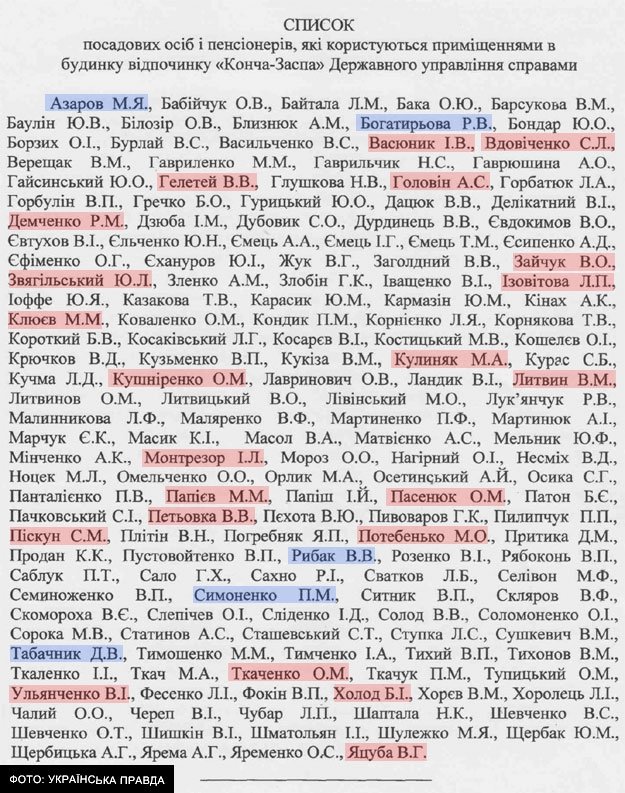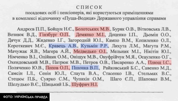 "Українська правда" поцікавилася, хто досі утримується коштом платників податків – тобто хто має право проживання на території державних резиденцій "Конча-Заспа" та "Пуща Водиця". Станом на липень 2014 року адміністрація президента надала виданню такі списки мешканців: