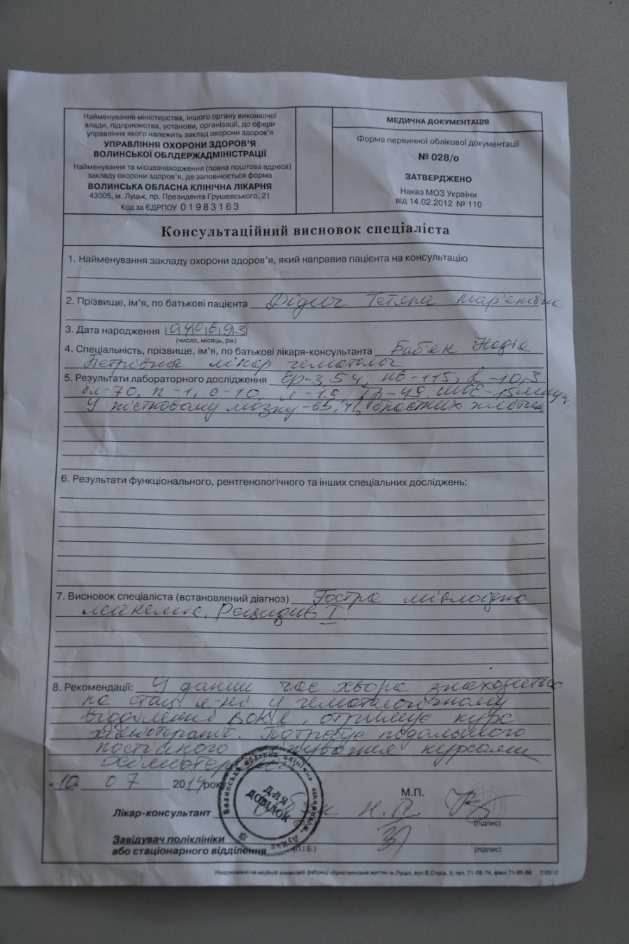 На даний час вона перебуває на лікуванні у гематологічному відділенні Волинської обласної клінічної лікарні та проходить курс хіміотерапії.