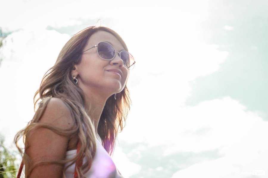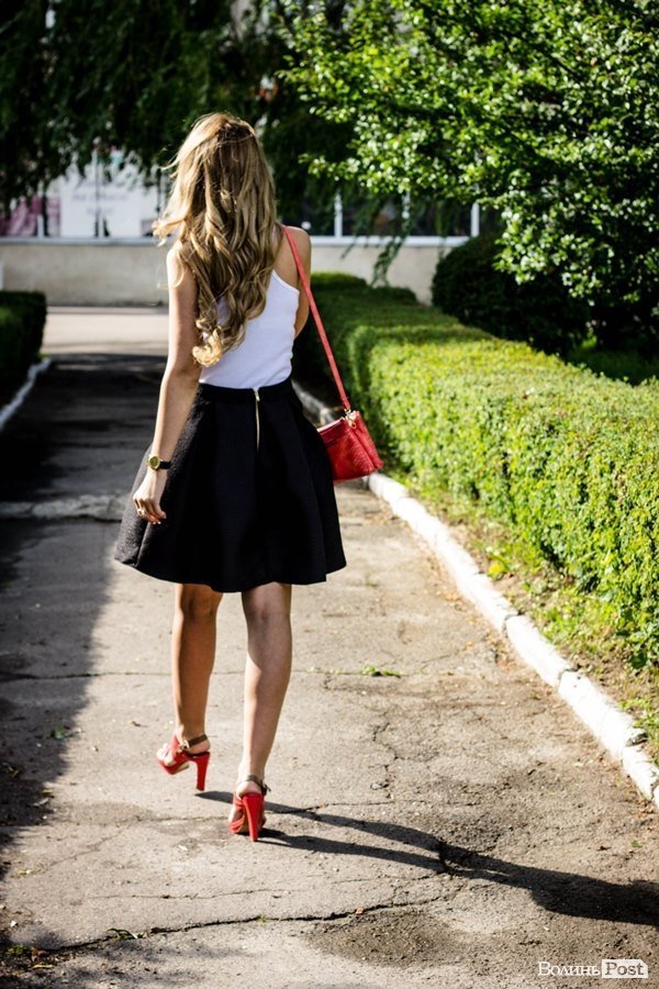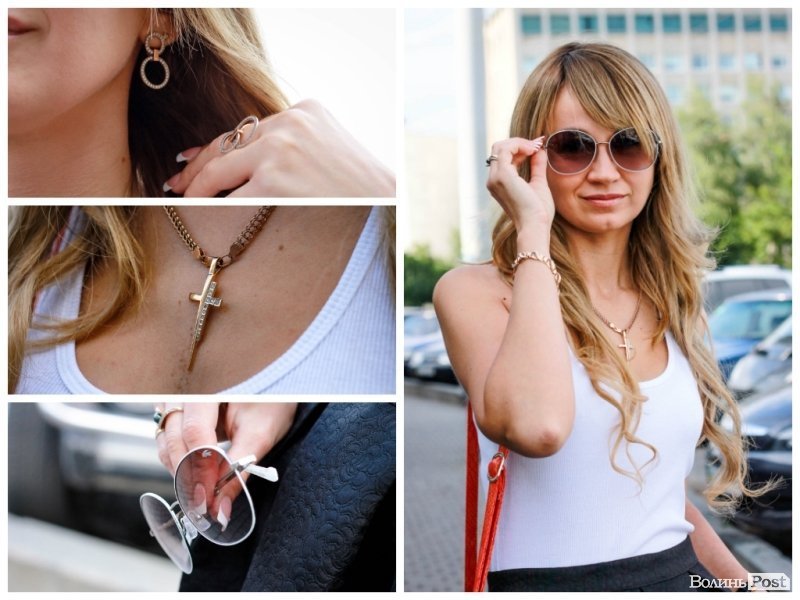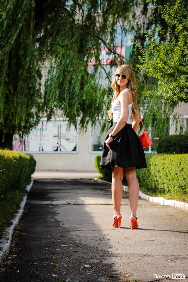 На фото Юлія одягнена у спідницю MIELCZARKOWSKI, босоніжки BASKONI, майку MARKS&SPENCER. Аксесуари: сумка SANKASLO , годинник TISSOT, окуляри LACOSTE, прикраси «МАЛЬВА».