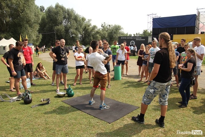 За сценою - змагання з піднімання гирі. Зібралося багато охочих взяти участь і так само багато - поспостерігати.
