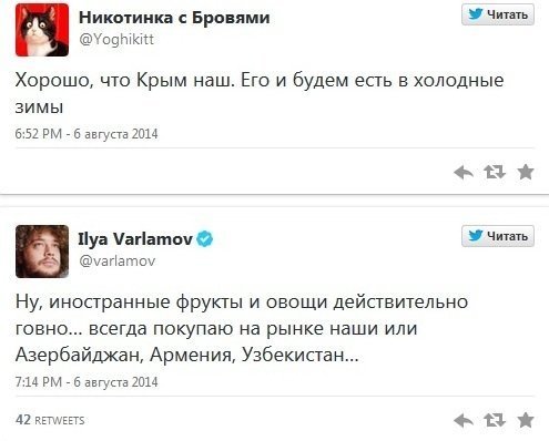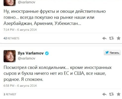 Але найчастіше хвилювання блогерів пов'язане з закордонним алкоголем. На тему заборони ввезення певних продуктів висловилися також популярні блогери російського "Твітера".