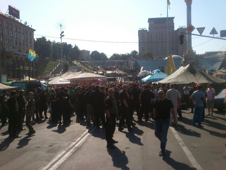 Також присутні міліціонери з батальйону "Київ-1". Частина з них мають автоматичну зброю. Між активістами та комунальниками виникають постійні словесні перепалки.