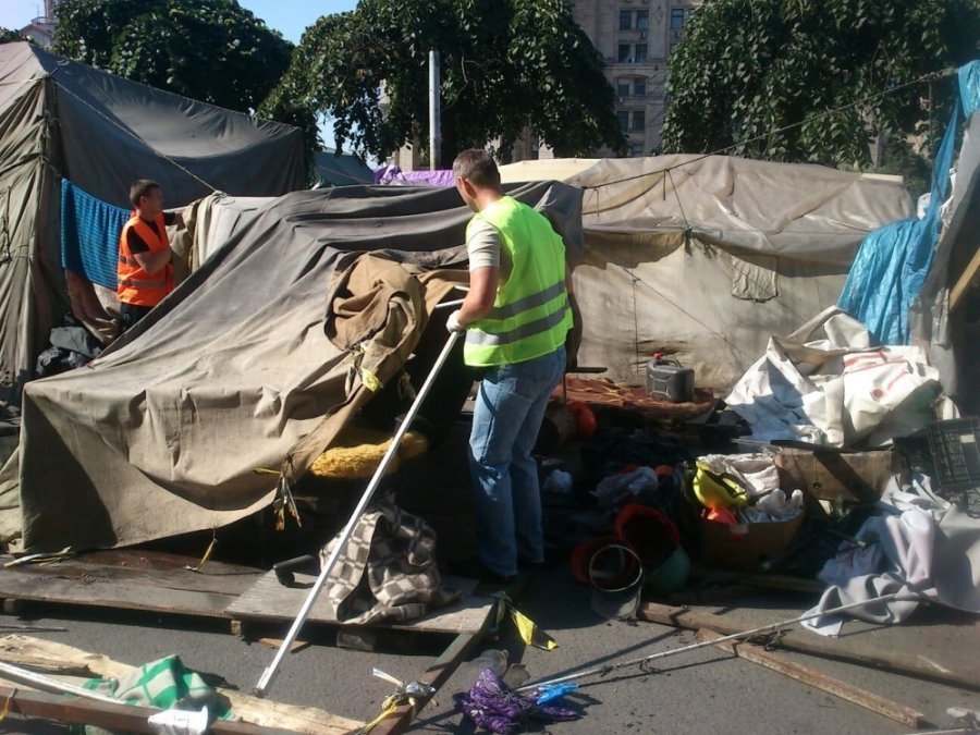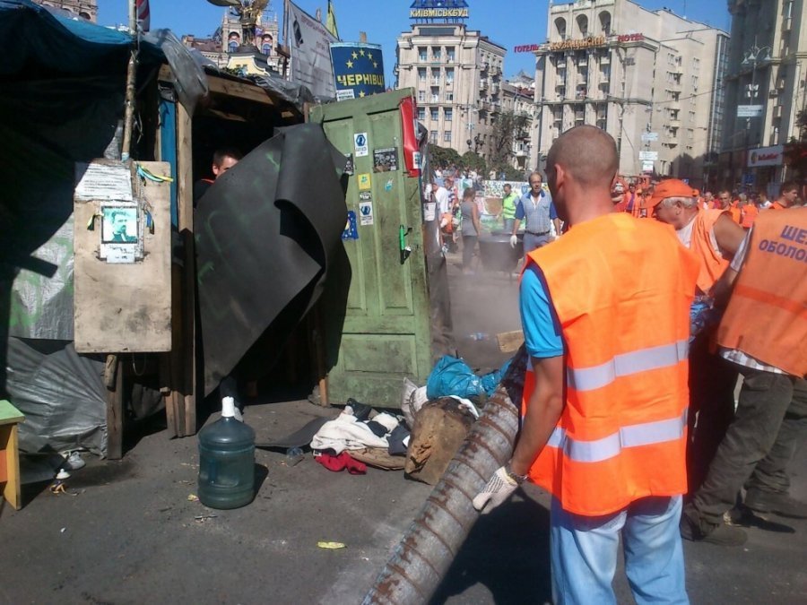 Незважаючи на спротив активістів, які живуть на Майдані, комунальники продовжують розбирати намети та барикади по всьому периметру Майдану крім вулиці Інститутської.