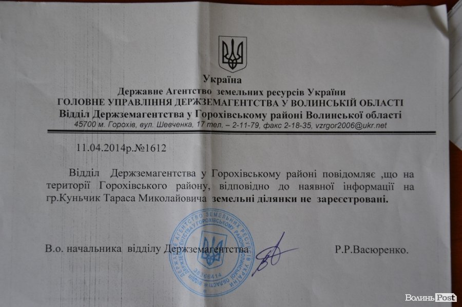 Також він надає довідку головного управління Держземагентства у Волинській області щодо відсутності у його власності земельних ділянок в Горохівському районі.
