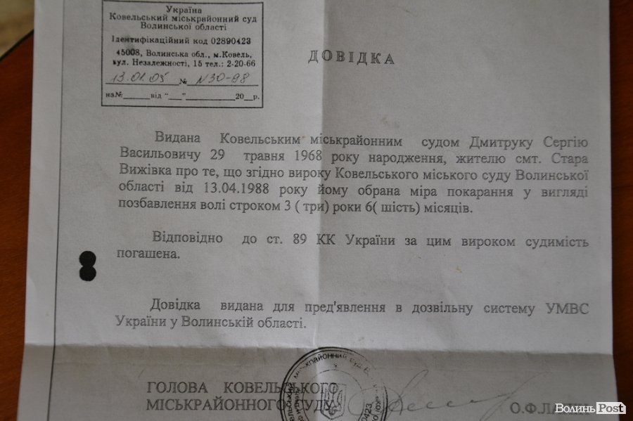 «Довідка видана Ковельським міськрайонним судом Дмитруку Сергію Васильовичу… про те, що, згідно вироку Ковельського міського суду Волинської області від 13.04 1988, йому обрана міра покарання у вигляді позбавлення волі строком 3 роки 6 місяців. Відповідно до статті 89 КК України, за цим вироком судимість погашена», - пишуть у другій довідці.