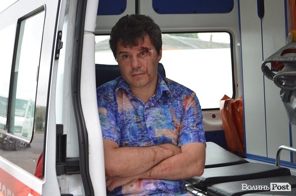 Сергій Слабенко перебуває в кареті швидкої допомоги, закривавлений. Пояснити, як трапилася аварія, не може. Стверджує, що алкоголю не вживав.