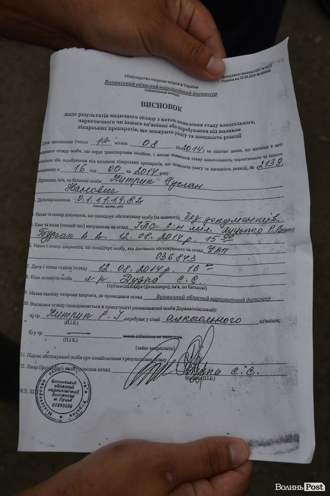 "Хитрик Р.І. перебуває у стані алкогольного сп'яніння", - йдеться у висновку за підписом Сергія Дудки, лікаря установи.