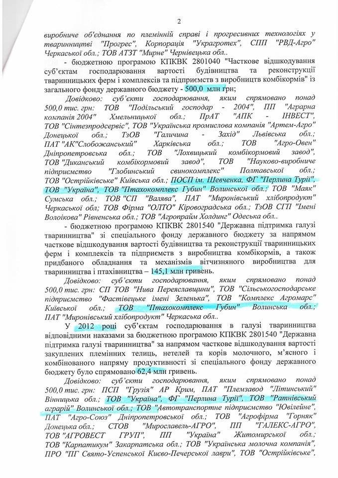 У листі йдеться, що в 2011 році за програмою "Селекція у тваринництві та птахівництві на підприємствах аграпромислового комплексу" підприємства отримали 45 мільйонів гривень.