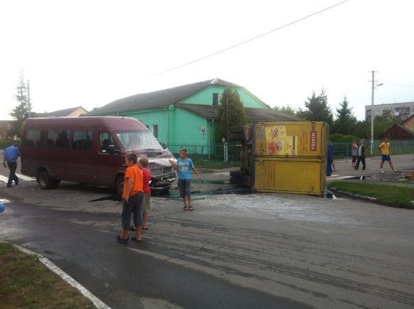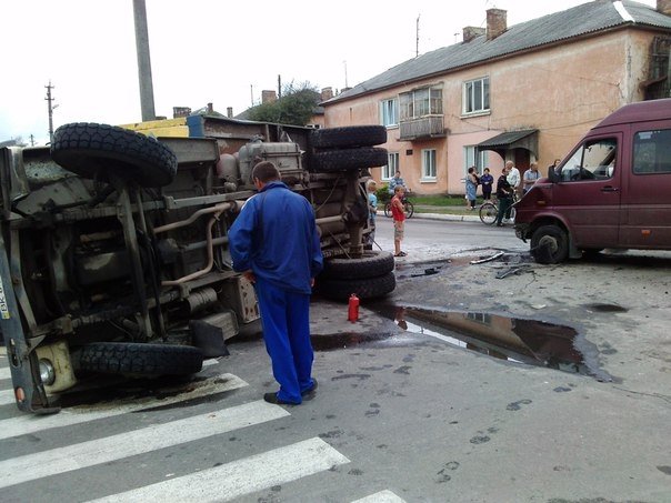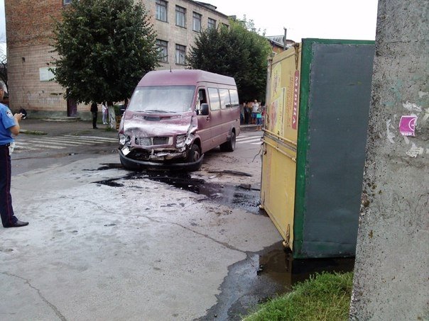 "тільки що о 17:15 біля водоканалу магазин віват, сталася аварія. маршрутка з людьми врізалася в грузовик. Постраждала жінка. Вона сиділа спереду біля і в неї перелом ноги. Її відразу забрала швидка. Коли маршрутка врізалася у вантажівку вона перевернулася", - повідомила користувач.