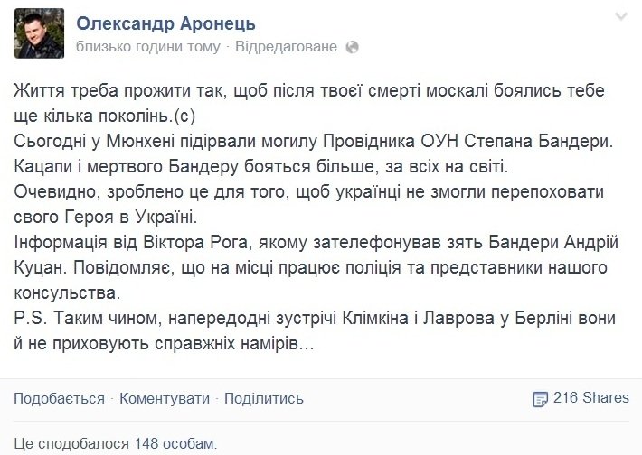 «Сьогодні у Мюнхені підірвали могилу провідника ОУН Степана Бандери. Кацапи і мертвого Бандеру бояться більше за всіх на світі», - написав свободівець.
