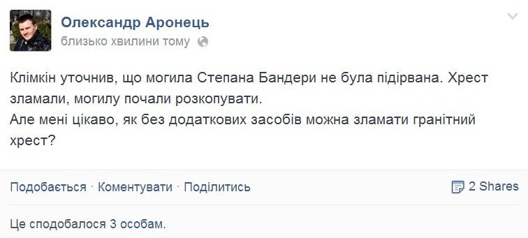 Однак згодом Аронець додав, що могилу не підірвали, а почали розкопувати. До того ж, зруйнували хрест.