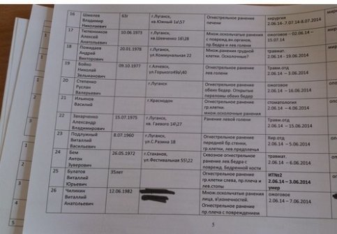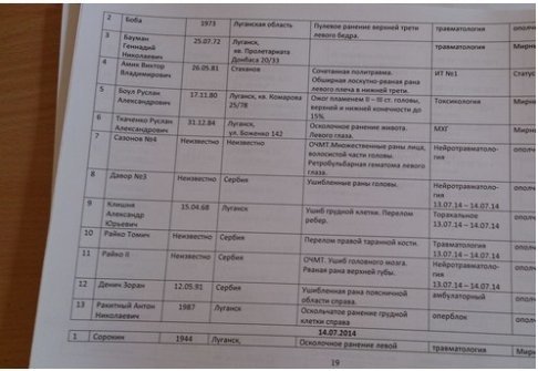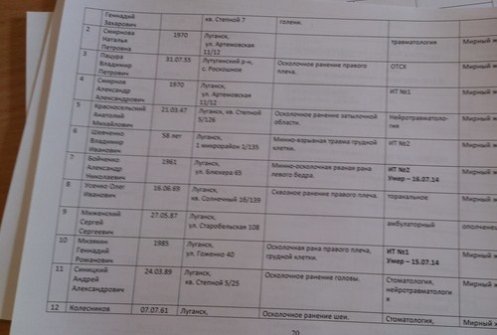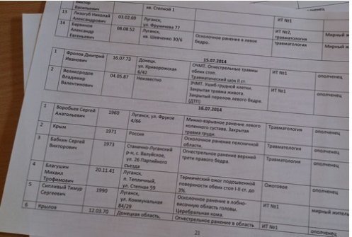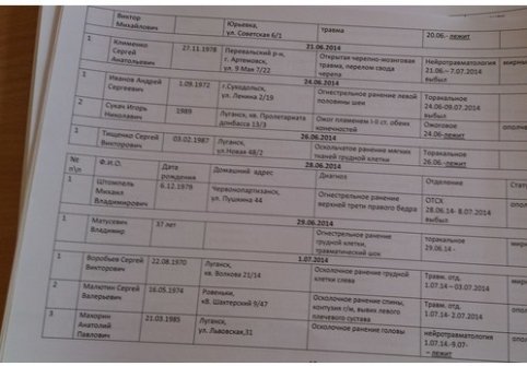 Чому ви розповсюджуєте наклеп. Адже це список пацієнтів лікарні. В списку на фото в останній графі я бачу помітку "ополчениє" тільки навпроти людини під номером 12. Прибиріть цю публікацію. Будьте пофесійнішими.