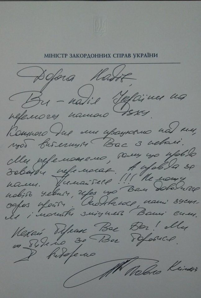 Міністр написав Савченко, що вона - "надія України на перемогу нашого і духу" і пообіцяв працювати над тим, щоб витягти її з неволі.