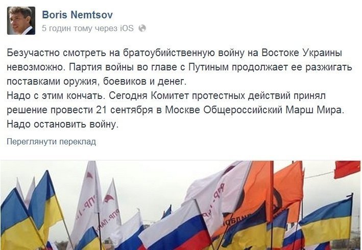 "Байдуже дивитися на братовбивчу війну на сході України неможливо. Партія війни на чолі з Путіним продовжує її розпалювати поставками зброї, бойовиків і грошей. Треба з цим кінчати. Сьогодні Комітет протестних дій прийняв рішення провести 21 вересня в Москві Загальноросійський Марш Миру. Треба зупинити війну", - підкреслив Нємцов.