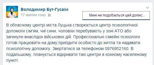 "В Луцьку створюється центр психологічної допомоги сім'ям, чиї сини, чоловіки перебувають у зоні АТО або загинули внаслідок військових дій. Професіональні сімейні психологи готові працювати на дому, приїздити особисто до житла та надавати психологічну допомогу. Звертатися за телефоном 0976952160. В подальшому, планується відкривати такі центри в кожному населеному пункті", - йдеться у повідомленні.