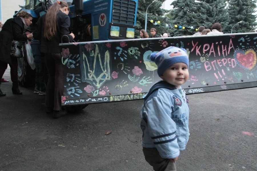 Наймолодші горохівчани ставили сині та жовті долоньки. Вправніші діставалися вікон, де намалювали тризуб та прапор. Кольори українського двоколору прикрасили також колеса трактора.