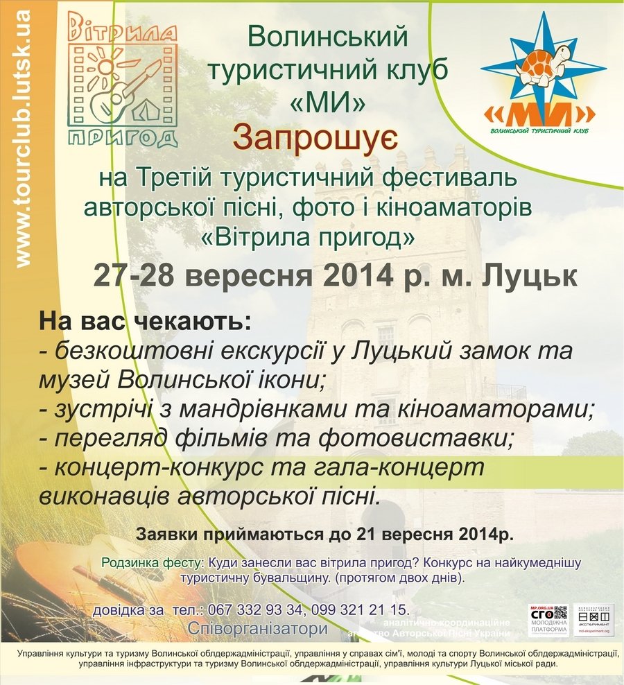 Волинський туристичний клуб «Ми» втретє проводить туристичний фестиваль авторської пісні, фото і кіно «Вітрила пригод», який відбудеться 27-28 вересня у місті Луцьку.