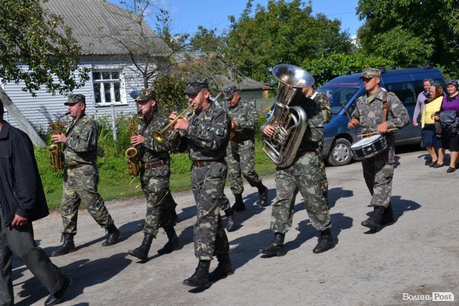 Потім жалобна процесія у супроводі оркестру вирушила на кладовище поряд із селом, де поховали бійця.