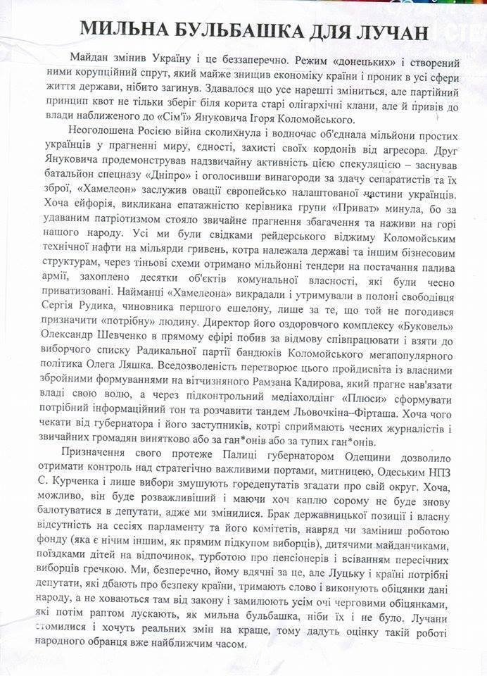 "Хтось поширює в Луцьку листівки з "наїздом" на Палицю і Коломойського, ксенофобськими зображеннями та позитивною згадкою про Ляшка. Доволі тупа спроба погратися у технології. Мудаки! Є зайві гроші на друк і поширення - віднесіть їх у госпіталь, віддайте "Самообороні", купіть щось корисне для армії!" - написав він.
