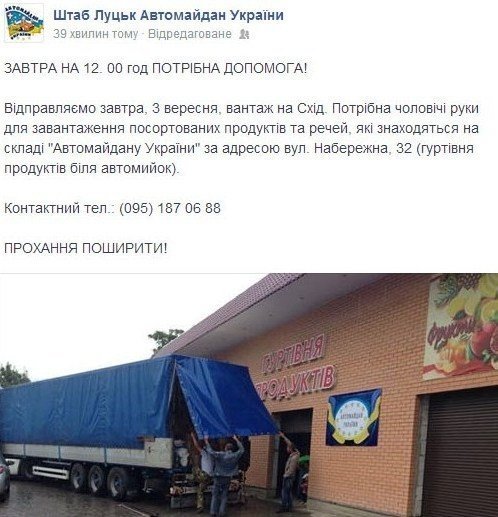 "Відправляємо завтра, 3 вересня, вантаж на Схід. Потрібні чоловічі руки для завантаження посортованих продуктів та речей, які знаходяться на складі "Автомайдану України" за адресою вулиця Набережна, 32 (гуртівня продуктів біля автомийок)", - йдеться в повідомленні.