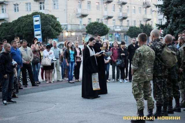 Перед від’їздом бійців ієрей Артем Кованський, священик Храму Холмської Божої Матері, прочитав молитву. Він розповів, що сьогодні благословляють патріотів, які йдуть захищати Батьківщину.