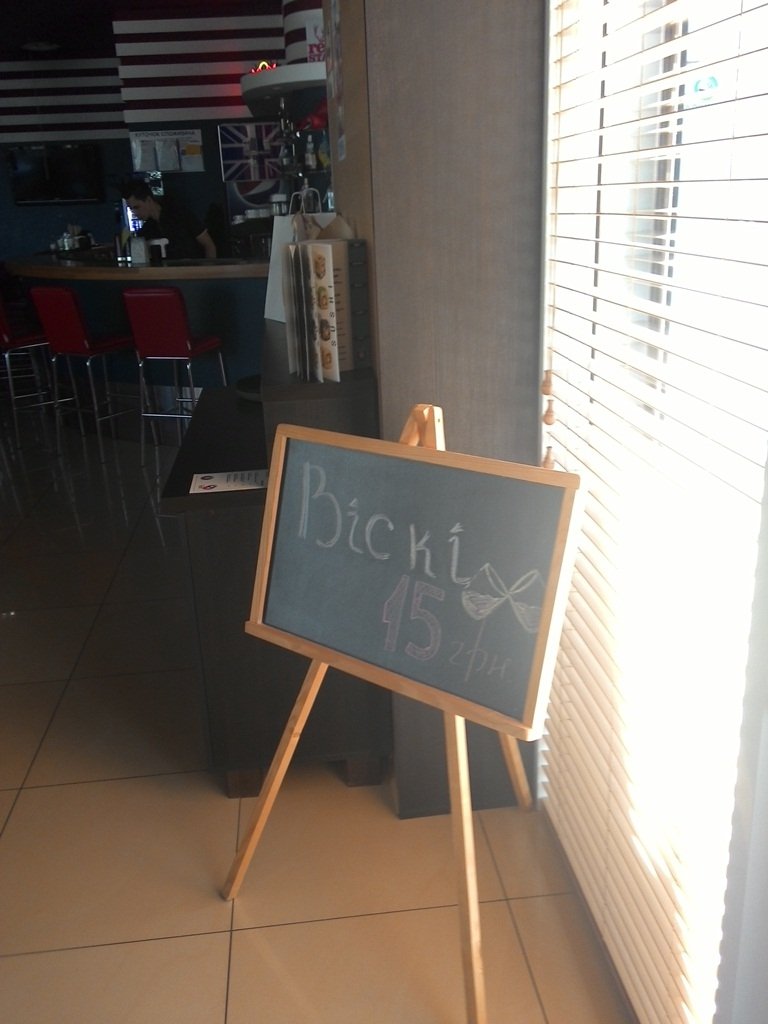 Ми вибрали: я – бургер з пивом, дружина – куряче філе з цукіні, грибами та сиром з узваром. Доці – чай (бо до нього дають печиво) і сирники. В зал час від часу виглядав молодий хлопець в кухарській уніформі. Я підійшов до барної стійки, поцікавився, що за віскі за 15 грн (інформаційна дошка при вході в заклад закликала). Сказав своє «фе»: віскі без назви - це як звертання до офіціанта «Дєвушка».