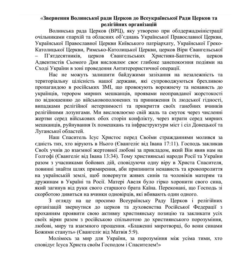 Волинська рада Церков просить Всеукраїнську раду церков звернутися до духовенства Росії та закликати російських вірян до миру та християнського порозуміння.