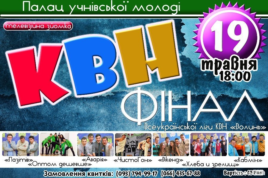 Фінал Всеукраїнської ліги КВН «Волинь» відбудеться 19 травня в Палаці учнівської молоді Луцька. В цьому сезоні команди зіграли вісім ігор і до фіналу дійшли лише найкращі.