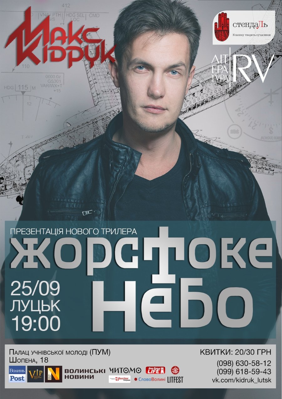Вже не вперше Макс Кідрук презентує свої книги в Луцьку, щоразу приємно дивуючи слухачів. Презентація, тривалістю в дві години, міститиме розповідь про формування фабули та персонажів роману, на глядача чекає короткий екскурс у принципи літакобудування та пояснення “ключів” до “Жорстокого неба”. Окрім цього, відразу можна буде придбати книгу та отримати автограф.