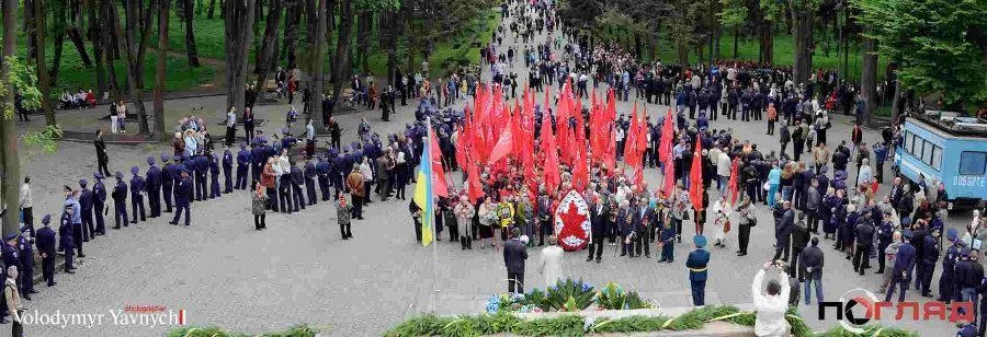 Колона комуністів, сформована біля виставки бронетехніки, рушила до Монументу слави в оточенні міліції. В той же час присутній в парку секретар міськради Ігор Турський заявив, що комуністи не подавали в міську раду заявку на проведення свого маршу.