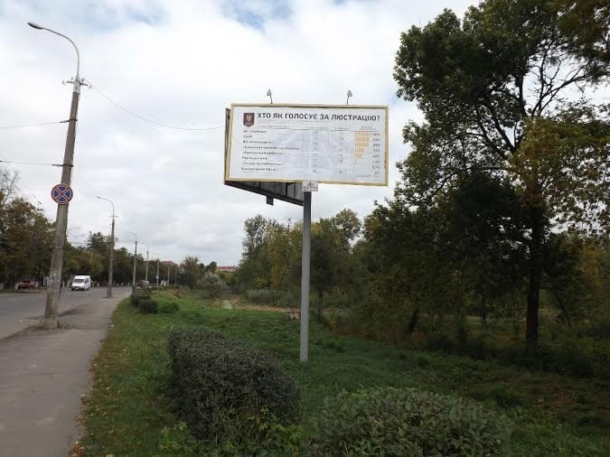 У місті Луцьку, виборчий округ № 22, на рекламних білбордах були розклеєні плакати під назвою «Хто як голосує за люстрацію?».