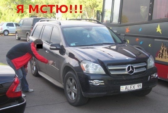На фото видно, як чоловік у чорно-червоній куртці щось мише на автомобілі Олександра Пищура. На фото також вміщений напис «Я МСТЮ».
