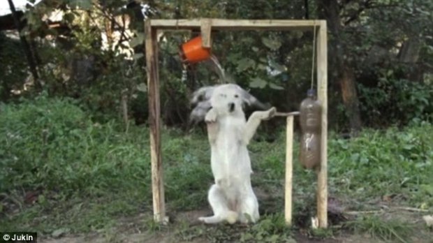 Собаці довелося стати на задні лапи і перекинути пляшку із піском, щоб облитися водою.