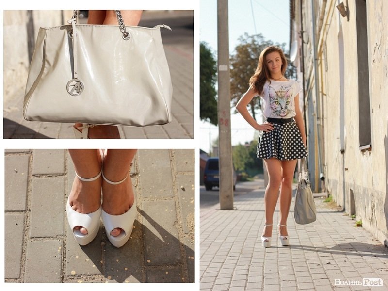 На фото студентка одягнена у спідничку, майку RESERVED, босоніжки. Образ доповнює сумка та підвіска у формі кота.