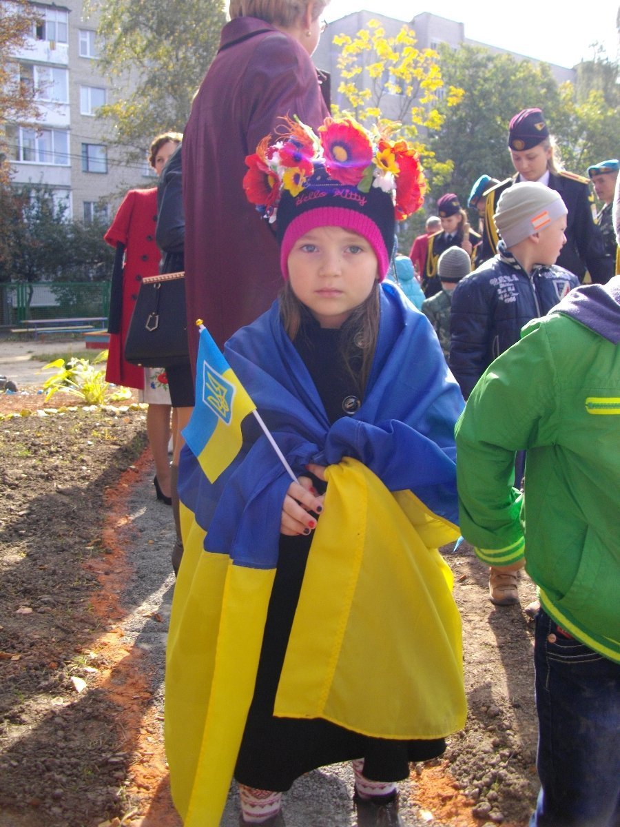 Під час відкриття майданчика вихованці Луцького ДНЗ №27 "Незабудка" у вишиванках, з паперовими голубами миру та жовто-блакитними стрічками в руках виконували патріотичні пісні й закликали до миру.