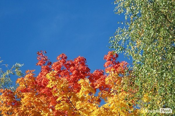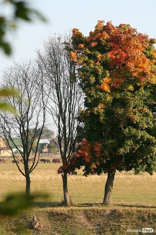Деякі дерева мають лише невеликі пасма осінніх кольорів, інші - ще зелені. А є й такі, де листя набирають жовтогарячих, червоних, або бордових тонів. Зазвичай це клени.