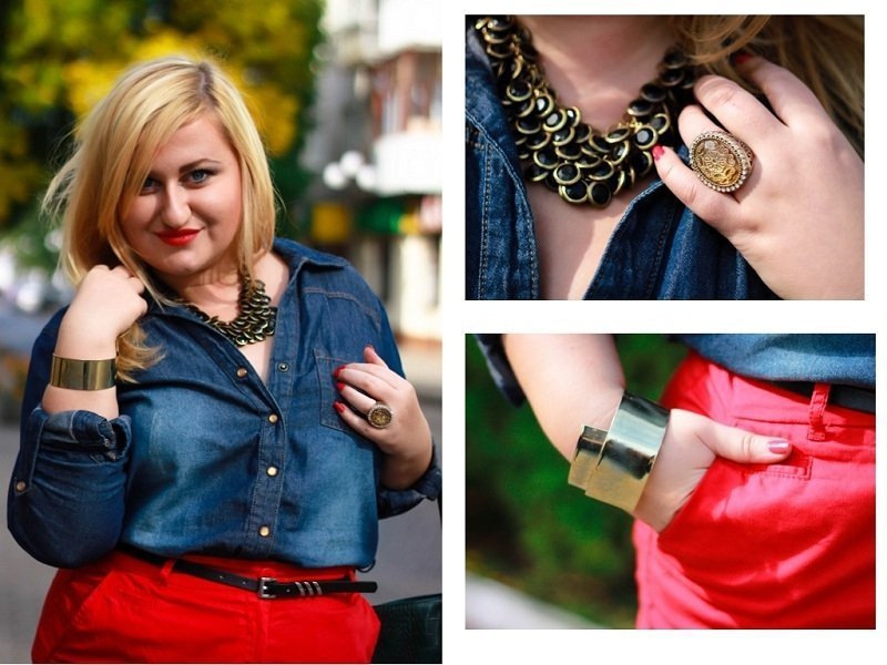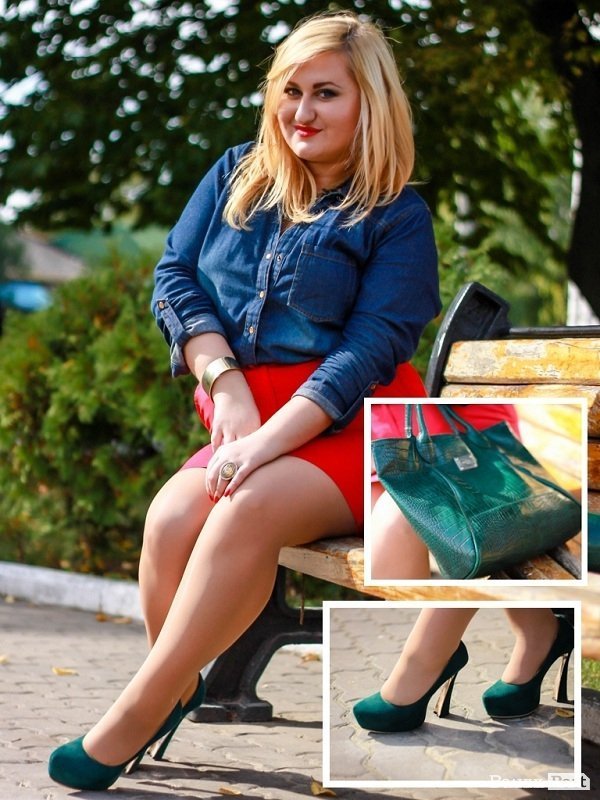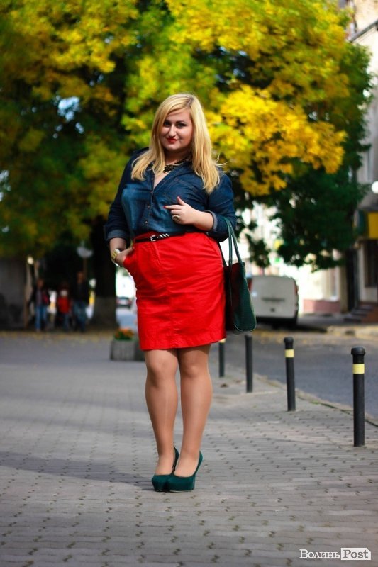 Героїня підібрала стильний образ. Сміливе контрастне поєднання синього джинсу і червоної спідниці.
