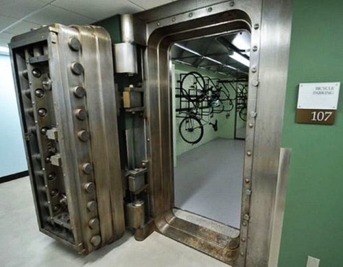 1. Парковка в банківському сейфі. Велопарковка в історичній будівлі, що колись належала Банку Орегона, займає зовсім небагато місця: на місці паркінгу раніше був сейф. Семитонні двері як і раніше на своєму місці, але зрушити їх з місця навряд чи вдасться.
