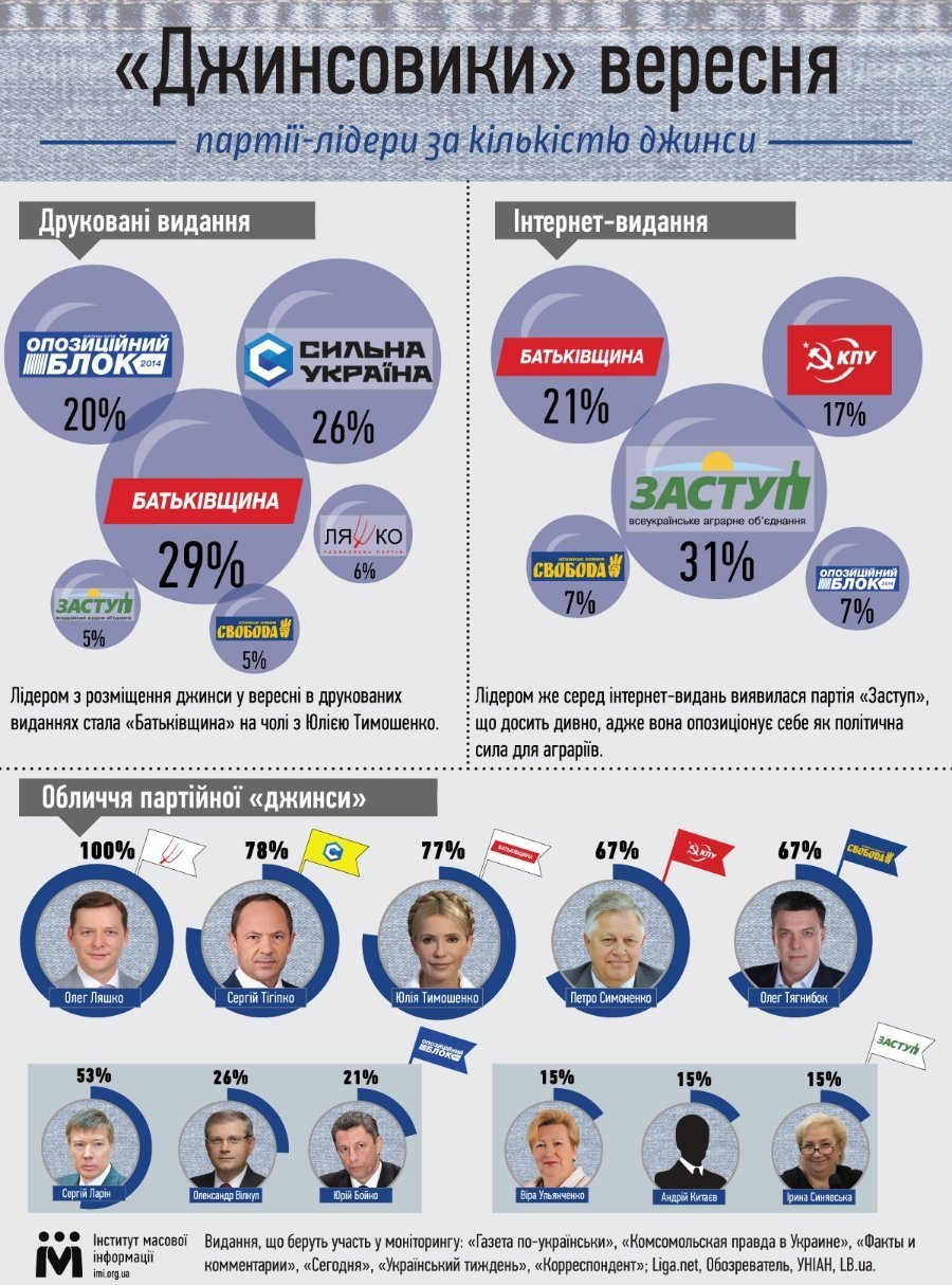У вересні лідером з розміщення джинси у всеукраїнських друкованих виданнях стала партія «Батьківщина», а в інтернет-видання — партія «Заступ».